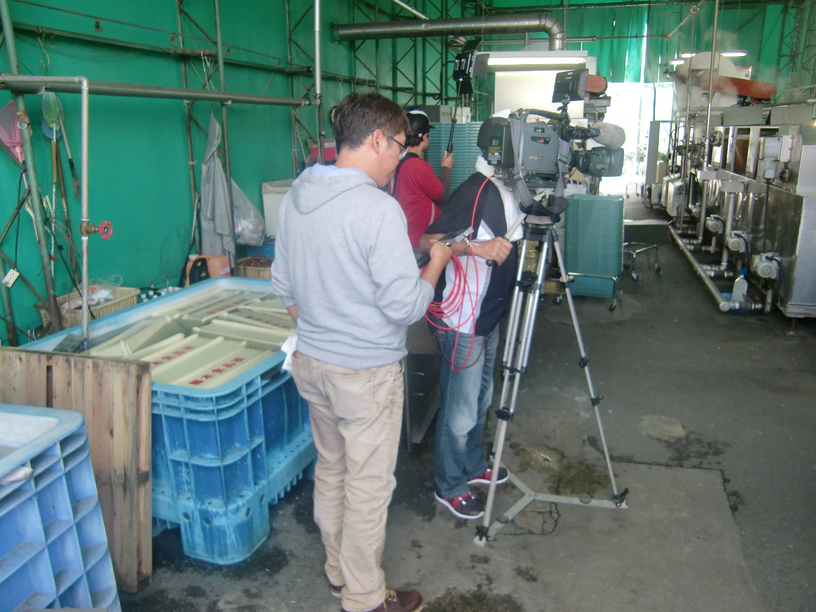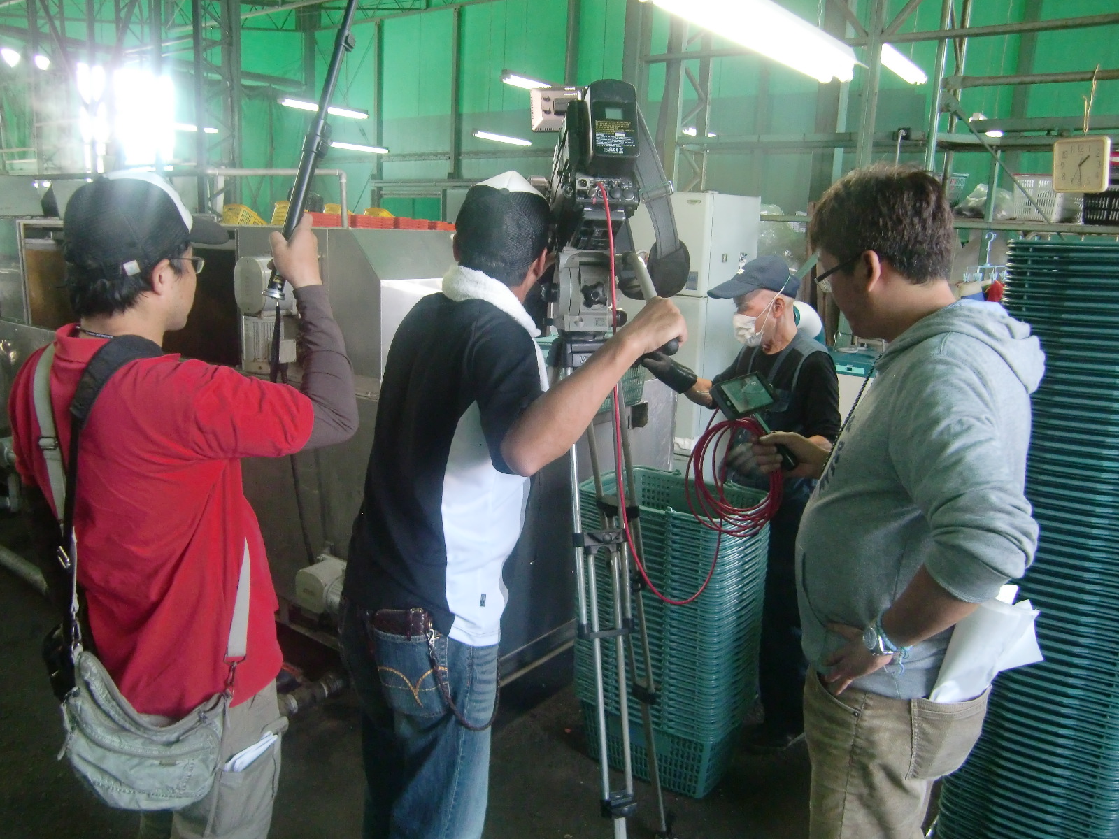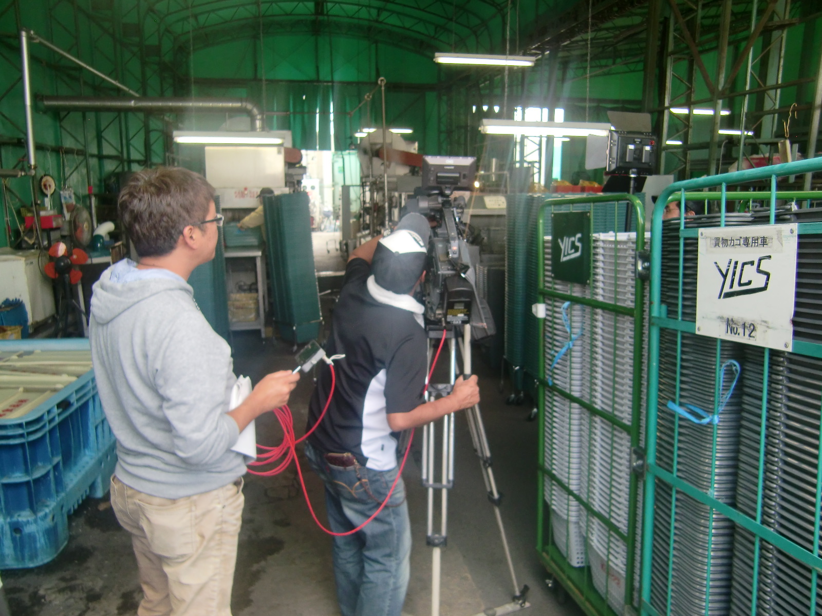 昨日、弊社が大変お世話になっている”買い物かごメーカー大和産業株式会社様”の取材の一環で、大和井上クリーンサービスで読売テレビの番組「大阪ほんわかテレビ」の撮影がありました。撮影と言っても弊社の社員がしゃべるわけでなく(もちろん私も出演しません)、買い物かごの洗浄されている様子を取材したいとのことでした。放映時間は数分(弊社のところは数秒)と聞いていましたが、それに1時間半ほど撮影されていました。大変なお仕事だということがよくわかりました。放送日程が決まり次第連絡させていただきます。乞うご期待ください。