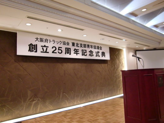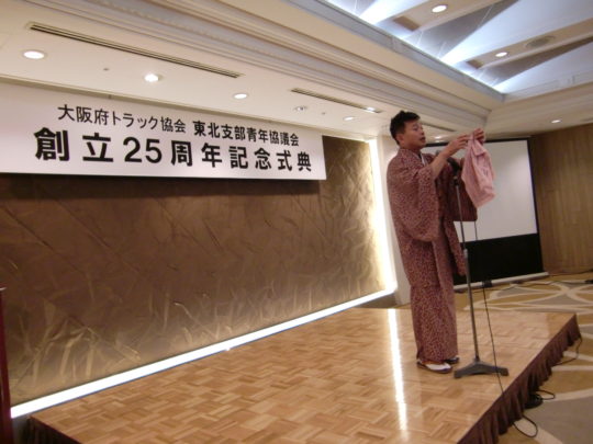 18時からの式典は、幸多会長の挨拶、来賓の中原大阪府トラック協会副会長・尾崎東北支部支部長・OBを代表して北村第2代会長の祝辞、25年の歩みDVDの上映、25周年記念事業の発表と盛りだくさんの内容で行われました。続く懇親会は、谷大阪府トラック協会青年部部会長による乾杯で幕を開けました。途中、桂米朝師匠の15番弟子にあたる、桂勢朝師匠による余興が行われ、時間がたつのも忘れ、とても楽しく過ごすことができました。私も10年間お世話になった青年協議会。トラック業界のことを全く分かっていなかった私の基礎を作ってくれました。本当にお世話になりました(まだ、特別会員ですが・・)。今後ますますのご発展を祈念いたします。